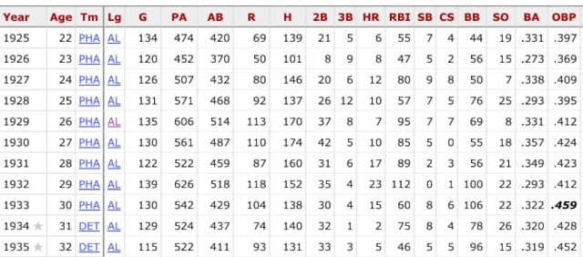 Below are Cochrane’s first eleven seasons; you can pick out his best eight. In those eleven years, not only did Cochrane win two MVPs and three World Series, but he did that by Catching 110 or more games in each season. There was no DH in those days, so all but one of the 1,411 games saw Cochrane behind the plate.