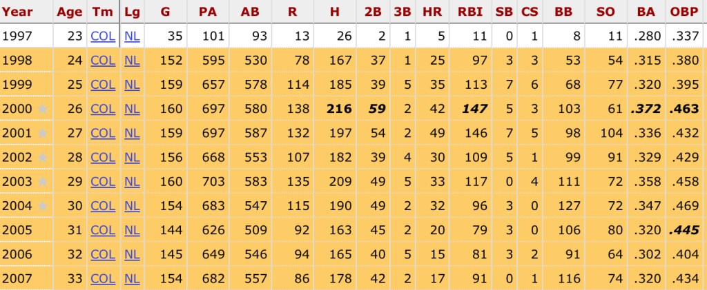 There’s no debate about how great of a Hitter Helton was, looking at his prime (Highlighted) year-by-year statistics via Baseball Reference.